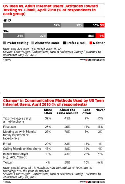El 57% de los adolescentes (entre 15 y 17 años) prefieren comunicarse a través de SMS antes que por correo electrónico, según un estudio de ExactTarget destacado por eMarketer y realizado entre jóvenes y adultos estadounidenses. El 22% afirmaron que ambos medios les satisfacen y el 16% antepuso el email.